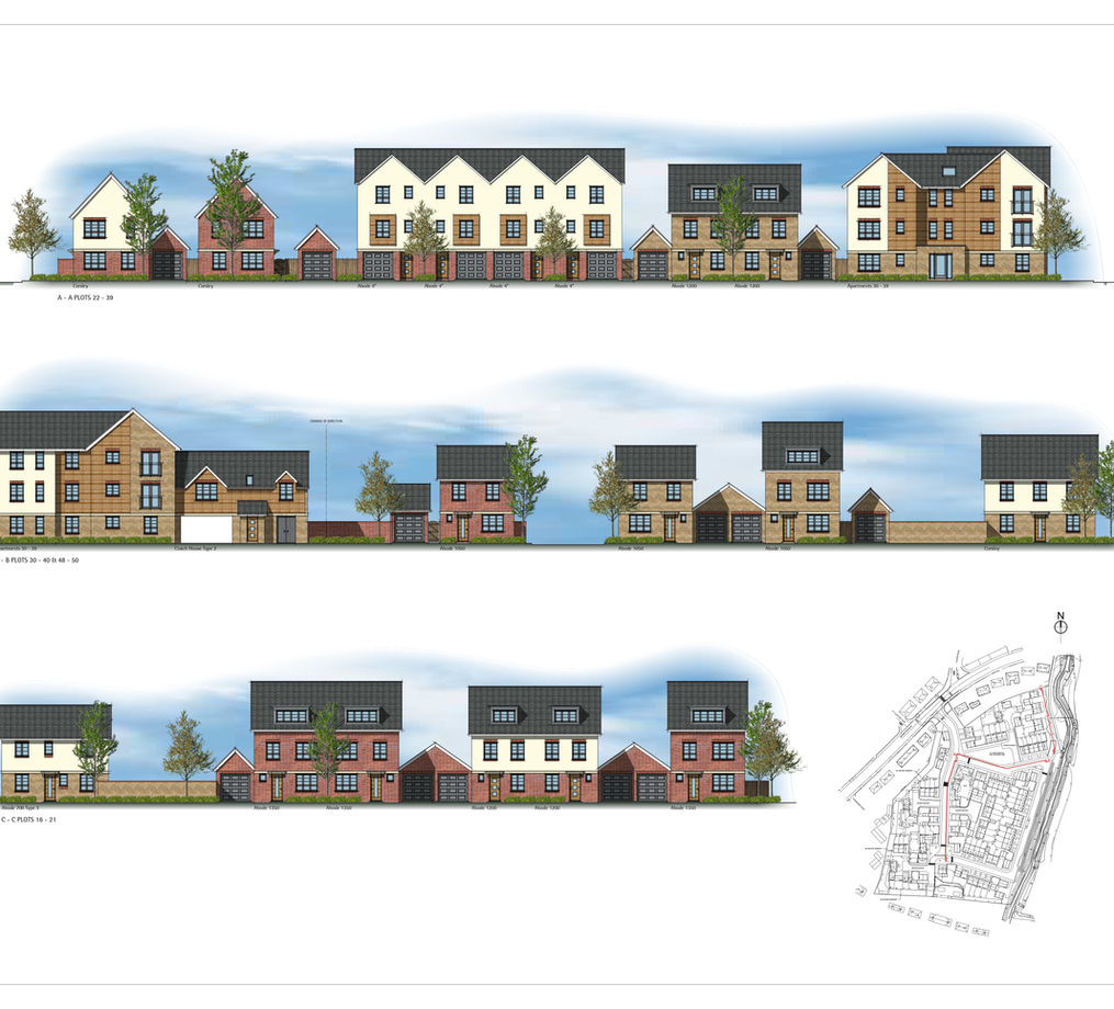 CDS was appointed to provide the details for a full planning application for a total of 93 private and 17 affordable dwellings with 2, 2.5 and 3 storey house types, in a mix of 1 to 3 bedroom apartments and townhouses. The development also provides a number of pedestrian links to the surrounding areas, green open spaces and a sustainable storm water drainage system in the form of swales.